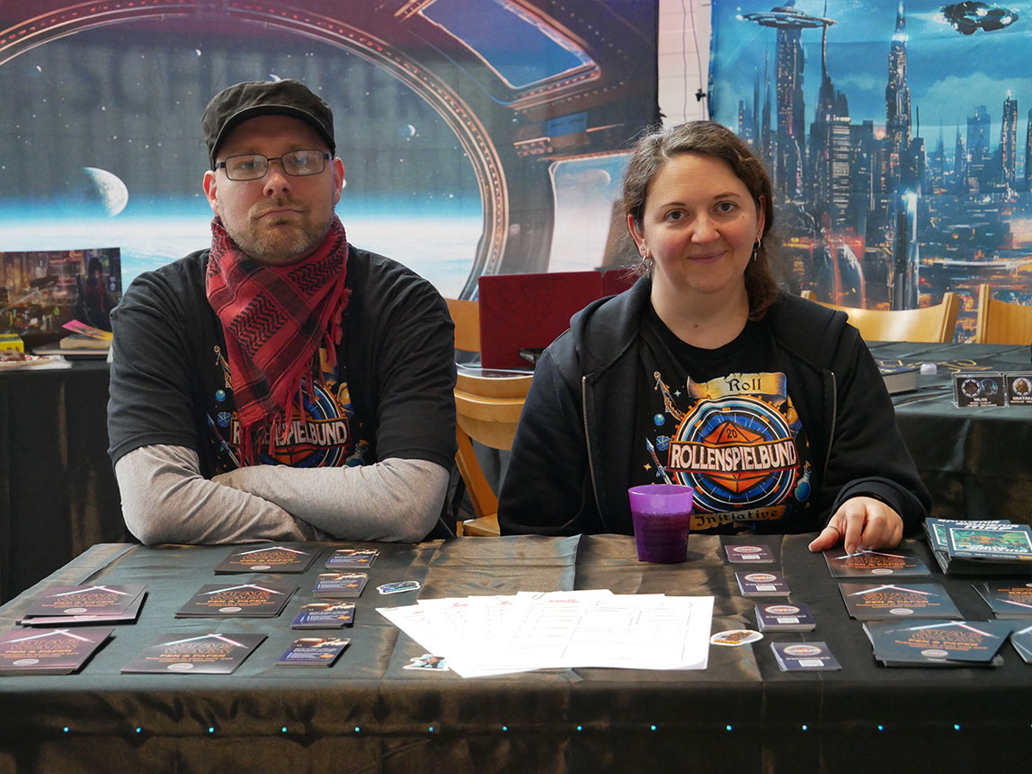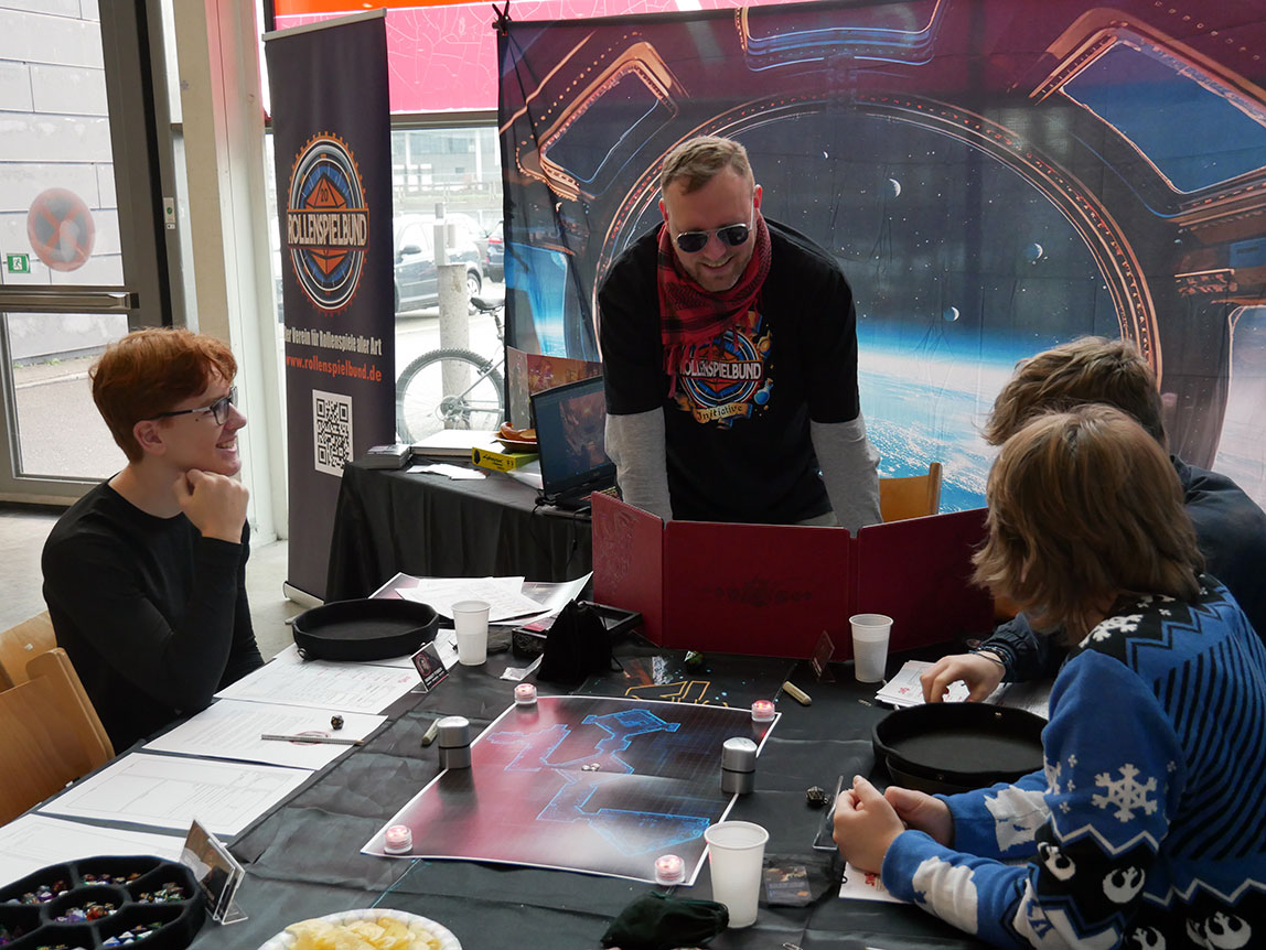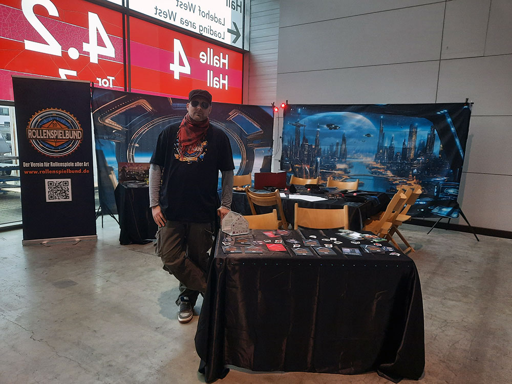Unser Ziel war klar: den Rollenspielbund sichtbar machen, neue Mitspieler gewinnen, Neugier wecken und vor allem Spieler für unsere geplanten Runden finden. Gerade Letzteres stellte sich als schwieriger heraus als gedacht. Die Vorstellung, sich für ein bis zwei Stunden an einen Tisch zu setzen, während draußen das riesige Con-Programm lockte, war für viele eine echte Hürde – selbst bei großem Interesse. Umso mehr haben wir uns gefreut, dass die Runden am Ende doch zustande kamen.